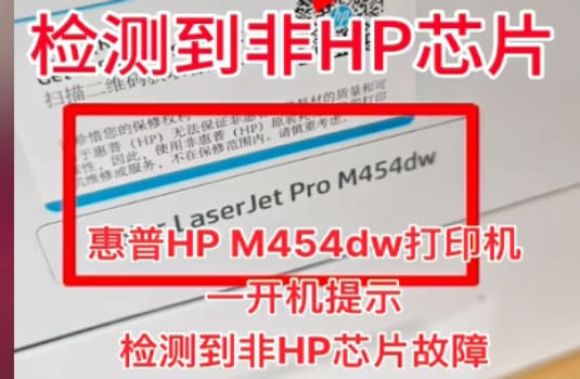 惠普HP M454dw开机即报“检测到非HP芯片”时,通常意味着打印机无法验证正在使用的硒鼓身份。这并非简单的识别 ,可以远程处理,通过刷主板降级机器就好了